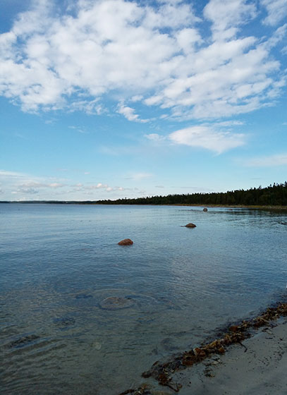 Над морем где-то на горизонте висела темная туча, и были видны струи дождя. А на пляже — Солнце, прозрачная холодная вода, чистый воздух, моментально прогретый солнечными лучами… Сосны за спиной. Камни, белый мох. И тишина.