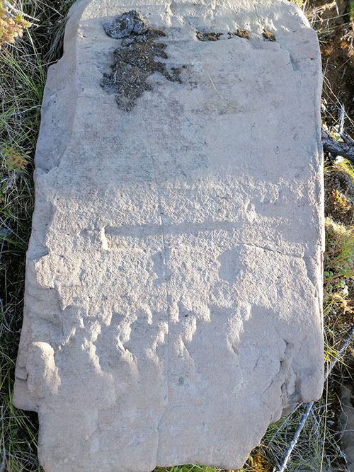 На фото 1 белый камень (почти прямоугольник). По обеим сторонам рисунок как «трактор проехал», а в середине четкий выпил какого-то рисунка. Он напомнил мне выпилы на камнях на горе Нинчурт у Сейдозера (см статью Лады Виольевой), где расположены остатки древнего сооружения.